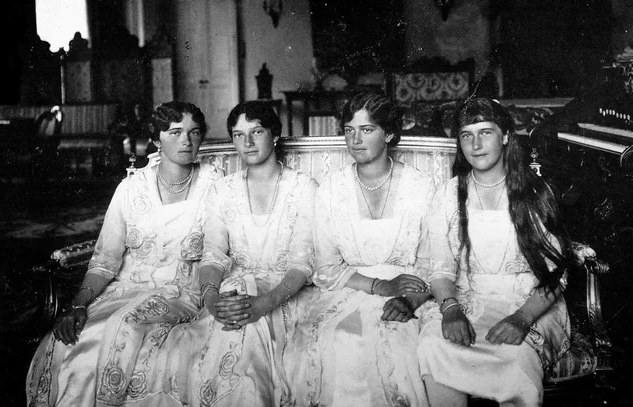 «11 августа 1916 года (24 августа 1916 года по западному календарю) Александра сообщила Николаю, что их дочери целый день позировали для новой серии официальных фотографий „для раздачи их комитетам“. Как оказалось, это были последние официальные снимки, когда-либо сделанные четырёх сестёр, фотографом Александром Функом. Освобождённые от своей обычной универсальной одежды — простых юбок и блузок, — девушки были одеты в лучшие атласные чайные платья с вышитыми панелями из роз, в жемчужных ожерельях и золотых браслетах. Анастасия, ещё не достигшая социально «освобождающего» возраста шестнадцати лет, носила длинные волосы распущенными, тогда как у трёх старших сестёр причёски были специально уложены в марсельские волны и собраны в шиньоны — вероятнее всего, парикмахером Александры Делакруа». |