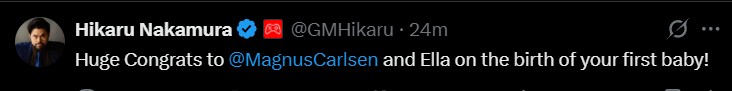 | Warmest congratulations to Ella and Magnus Carlsen on their wonderful new addition to the family 💙 A moment the chess world has been joyfully awaiting 😇😂 #FreestyleChess |