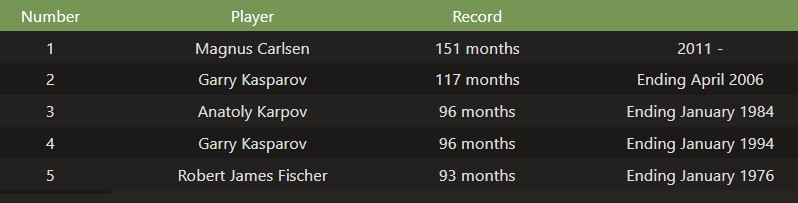 Carlsen took the number-one position in January 2010, but then Anand reclaimed the spot for a few months later that year and in 2011. Since July 2011, he has been uninterrupted as the world's highest-rated player.