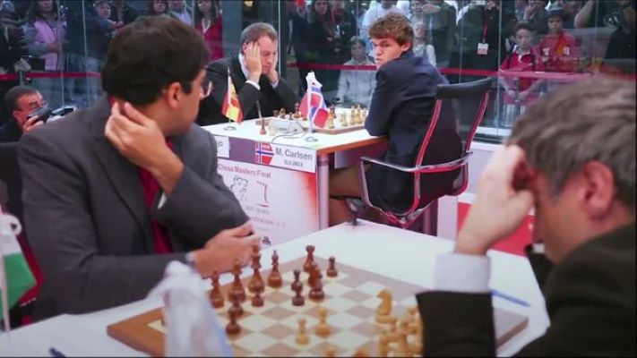 5-кратный чемпион мира Магнус Карлсен и 5-кратный чемпион мира Вишванатан Ананд смотрят на игру друг друга, в то время как оба их соперника чешут головы.