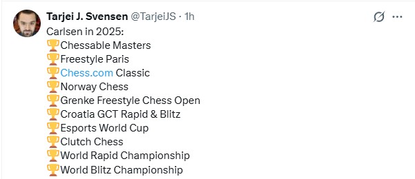 Это было ещё одно отличное выступление Магнуса на турнирах категории B. Он — один из двух величайших игроков всех времён. Но в классических шахматах в последние годы он уже не доминировал. У Гукеша 2024 год получился лучше, чем у Магнуса. Последний чисто классический турнир, который Магнус выиграл, — Вейк-ан-Зее 2022 года, четыре года назад. Я не утверждаю, что он не был бы фаворитом на любом турнире; просто стоит помнить, что все его коллеги относятся к тем соревнованиям, в которых он участвует, куда менее серьёзно, чем к турнирам, которые он пропускает.