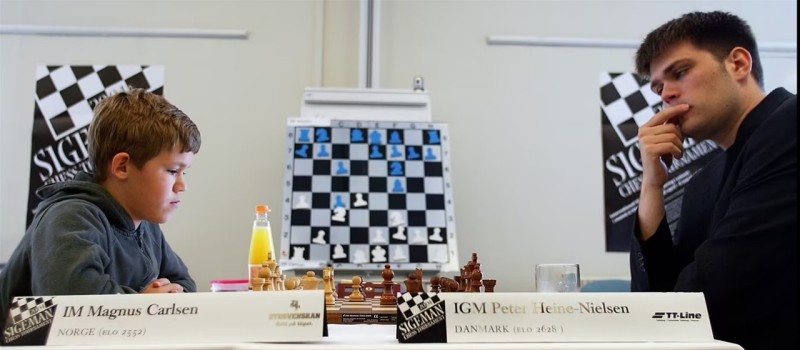 Отличная фотография партии между тогдашним IM Магнусом Карлсеном и его будущим тренером и секундантом, IGM Петером Хайне Нильсеном, сыгранной в 6-м туре турнира Sigeman 2004 года. Магнус выиграл эту партию.