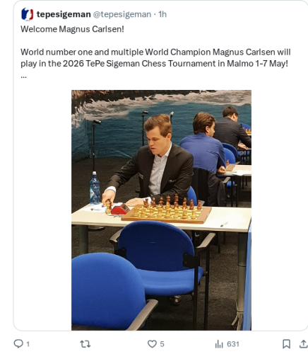 Приветствуем Магнуса Карлсена! Многократный чемпион мира Магнус Карлсен примет участие в шахматном турнире TePe Sigeman 2026 в Мальмё с 1 по 7 мая! Подробности последуют…