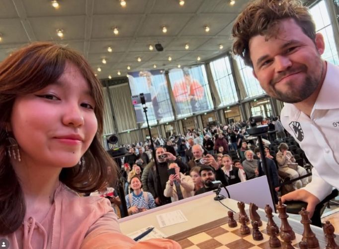 На прошогоднем ГРЕНКЕ точно такой же селфи с Карлсеном перед партией сделал Этьен Бакро. Алуа Нурман об этом помнила и всего лишь "повторила".