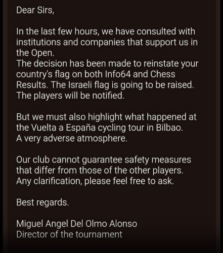 Организаторы открытого турнира в стране Басков (Испания) уведомили израильских участников, что флаги страны, а также указание Israel (ISR) не будут использоваться ни на игровой площадке, ни на карточках участников, ни на онлайн-платформе с жеребьевкой и результатами турнира.