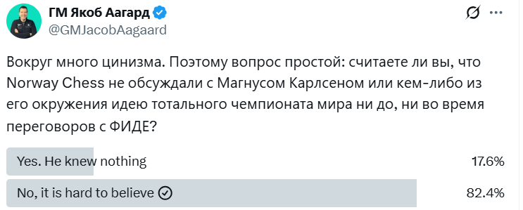 Это не имеет никакого отношения к отношениям Магнуса и ФИДЕ. Отношения Norway Chess с Магнусом всегда были хорошими, поскольку мы всегда уважали его как игрока и никогда не вовлекали его в нашу работу. Мы разработали эту новую концепцию именно таким образом, потому что искренне верим, что это то, чего хочет шахматный мир, и что новые форматы важны для дальнейшего повышения интереса к шахматам.