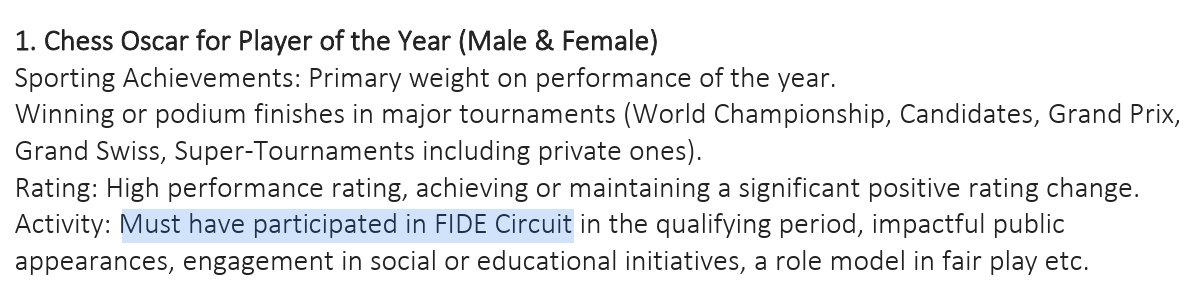 ФИДЕ объявила о новой награде «Шахматный Оскар», с требованием, что победители «должны были участвовать в турнирах ФИДЕ» и иметь «влиятельные публичные выступления, участие в социальных или образовательных инициативах». |