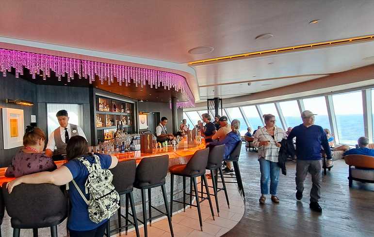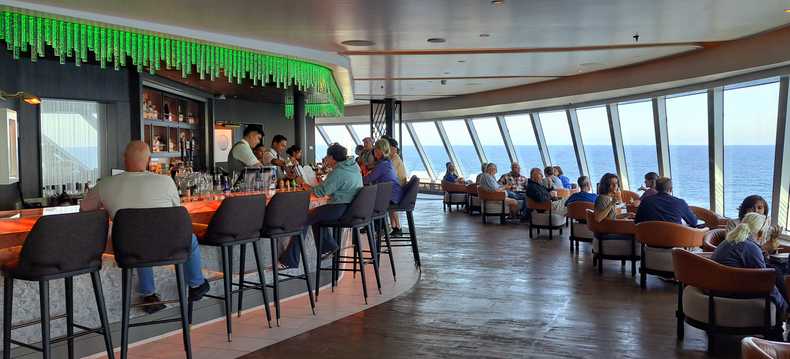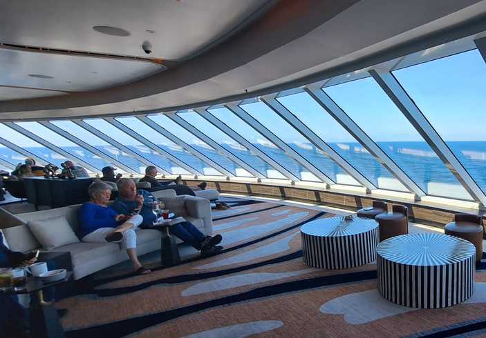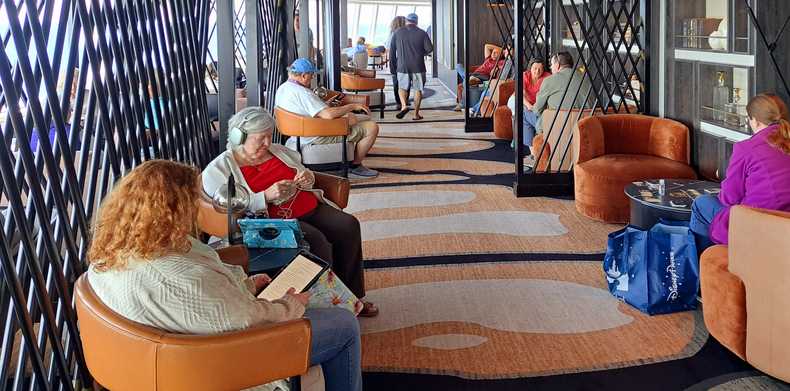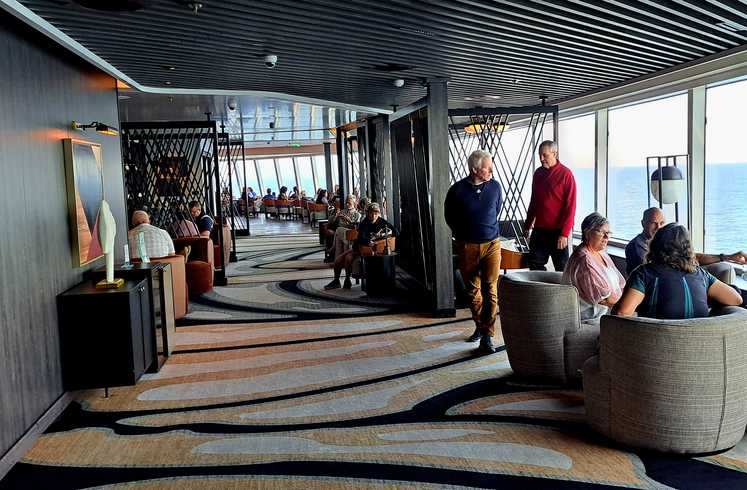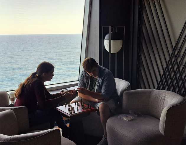 Чтобы успеть в норвежский город Берген вовремя (там же тоже заранее людьми куплены экскурсии) кораблю нужно было на всех парусах мчаться, ведь он в Амстердаме простоял лишних 5 часов. А мы с женой хотели гле-нибудь пристроиться с видом на море, но чтобы не было холодно. Таких желающих было полный корабль, так что мы сделали круг по обзорной палубе и не смогли найти места для двоих. После Амстердама корабль был полностью укомплектован пассажирами. Вот, что мы примерно наблюдали пока искали подходящие нам места возле окон: