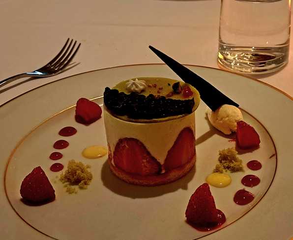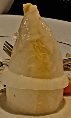 Несмотря на качку, официанты еще могли шутить. Они принесли на подносе горячее блюдо, закрытое крышкой. Открыли - а под крышкой ничего нет. Типа, извинились и через полминуты другой официант принёс что полагалось. Что мы заказывали уже не помню, но необычное сфотографировал. Это у жены какой-то овощ (теперь жена не может вспомнить, что это было):