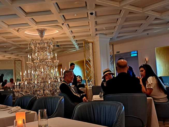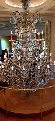 Поэтому вечером мы пошли в самый низко-расположенный ресторан. В надежде, что поскольку он был платным и дорогим (французская кухня), там будут свободные места. Но оказалось, что туда только по предварительной записи. Записались. Меня интересовало как там люстры в качку себя ведут. Оказалось, что люстры на распорках между потолком и полом: