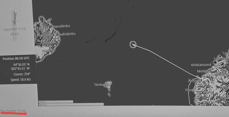 По мере продвижения к Исландии шторм утихал. Если раньше сила ветра доходила до 70 узлов, то сейчас уже была меньше 50. Глядя на навигационную карту я заметил, что несмотря на открытый океан, эхолот иногда показывает очень малую глубину - буквально сотню, а то и меньше метров. Никогда не думал, что такое возможно. Стал следить и вот мой рекорд - 11 метров… я подчеркнул красным эти показания. Но очень много раз было когда меньше сотни метров. Это полпути от Норвегии до Исландии (грубо 500 км от их берегов).