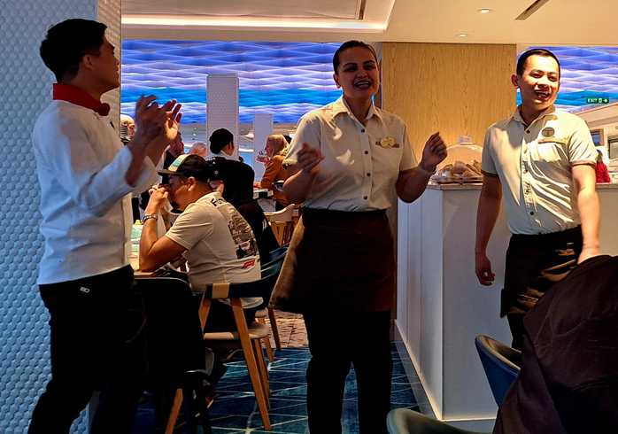 Вообще, я не люблю рестораны - все нужно долго ждать, никогда не знаешь точно что и сколько принесут, излишняя болтовня официантов, а на корабле в ресторан еще и костюм надевать. Самое лучшее для меня - шведский буфет. Качество еды ненамного хуже, сразу видишь что берешь и сколько. Но в этот раз и у него был недостаток. Дело в том, что какой-то менеджер придумал, что нас должны обязательно смешить во время еды и была собрана команда «клоунов», которые изо дня в день остроумничали одним и тем же способом.