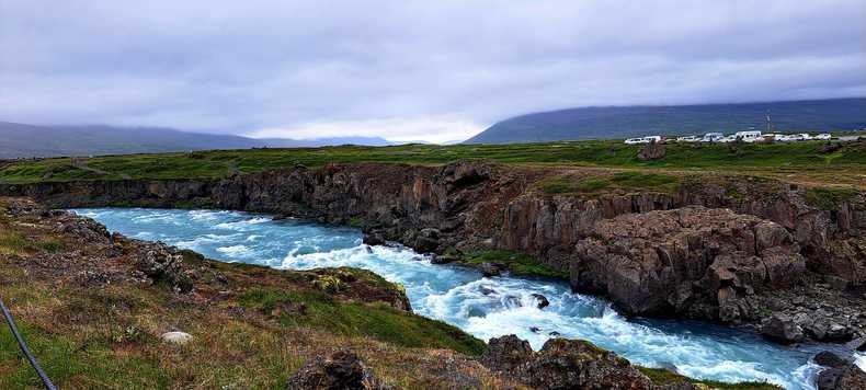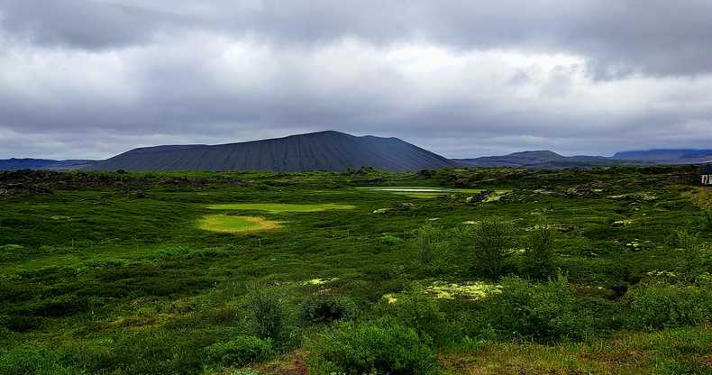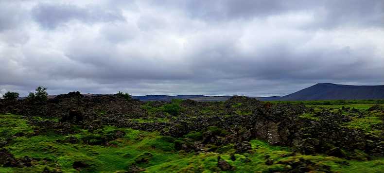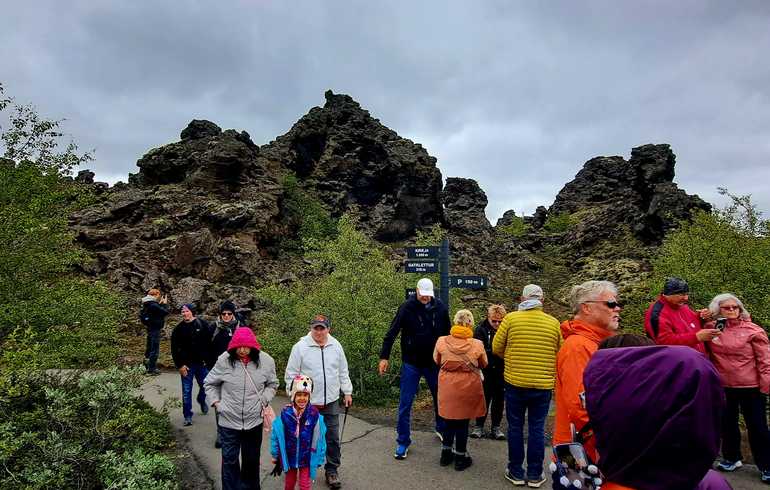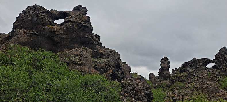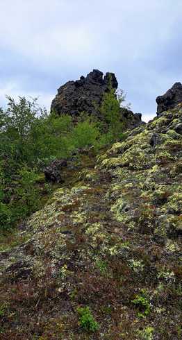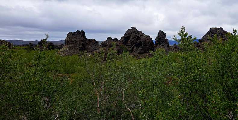 А повезли нас на объект в 50 км от Акюрейри. Называется Диммуборгир. Этот объект образовался более 2 тысяч лет назад. Тогда было мощное извержение вулкана, лава которого достигла озера, которое испаряясь, быстро охлаждало и дробило лаву. В результате образовались наросты с глубокими кавернами. Теперь Диммуборгир служит отличным местом гнездования различных видов птиц, в том числе соколов, а также сюда возят туристов. И, конечно же, в Диммуборгире живут тролли. Это их штаб-квартира.