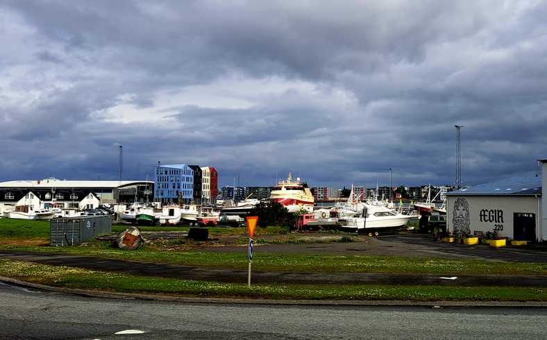 Порт находится примерно в 10-15 км от Рейкьявика, поэтому мы сначала проезжали пригороды. Дождь прекратился и даже выглянуло солнце. Сначала проезжали городок Hafnarfjarðarkaupstaður, это полное название для ясности о каком городке идет речь, а краткое Hafnarfjörður. Ничего в нем, похоже, нет особенного - только алюминиевый плавильный завод, да иногда проводят фестивали викингов. Но фото если солнечный день не такие уж мрачные: