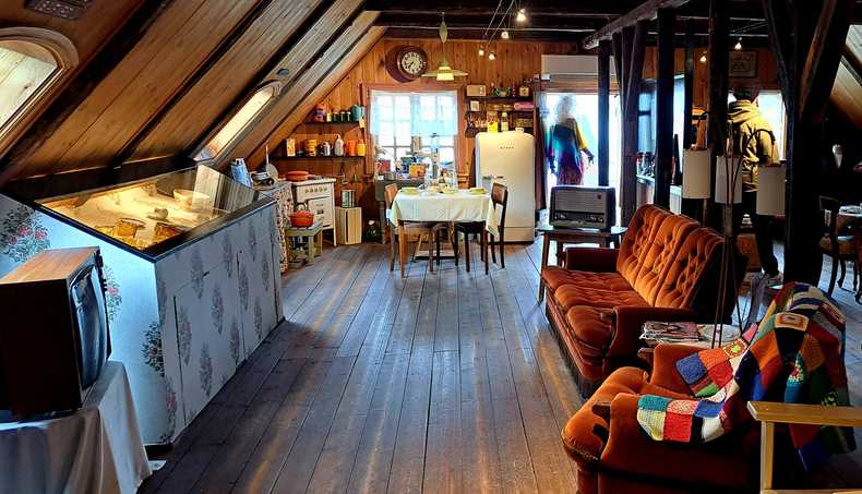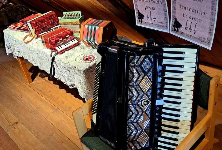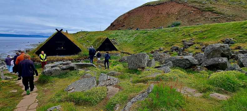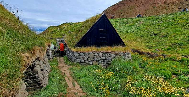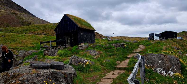 В этой деревне, как и везде в древней Скандинавии, дома с дёрновой кровлей. Нам рассказывали, что такие крыши делали тут еще с доисторических времён и накопили большой опыт. Собственно крыши снизу берестяные, а дерн эту бересту удерживает. Дерн двухслойный - нижний травой вниз, а верхний уже травой вверх. Американские современные крыши служат 30 лет, потом начинаются проблемы. Дёрновые крыши служили примерно столько же.