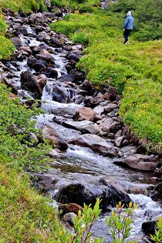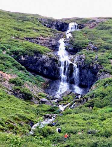 | Вот и всё с водопадом. И мы вернулись в порт к избушке-музею. Нужно сказать, что в этот раз у гидши были помощники - молодые стажеры, которые и наливали нам воду из ручья. В дальнейшем они предлагали помощь при спуска с лестницы в музее (подать руку) итп. А сама гидша уже целые две недели, как получила диплом экскурсовода, о чем нам гордо сообщила. |