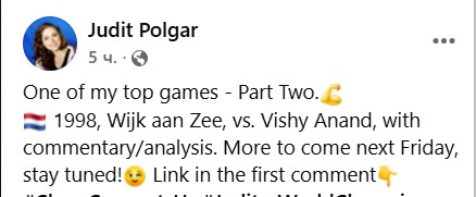 Эта партия, наверно, самая "громкая" из-за фамилии соперника, но для меня, конечно, самая красивая и памятная партия Полгар - ее победа в Кубке Европы 2002г. (где мы были одноклубниками) над Александром Мотылевым.
