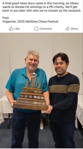 Итак, это БОЛЬШОЕ событие! Хикару Накамура, #2 в мире, внезапно появился на Морском шахматном фестивале в Саммерсайде, ПЭИ, без предварительного объявления. Если вы не в шахматном мире — это как если бы Rolling Stones неожиданно сыграли в каком-нибудь маленьком баре, чтобы репетировать, а может, и заимпровизировать с местными музыкантами. Так они делают? Большой уикенд для Элис!