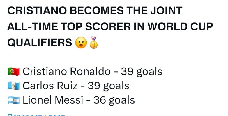 Роналду обошёл Месси по голам в отборочных матчах чемпионата мира — 38 против 36. Теперь до рекордного показателя Карлоса Руиса из Гватемалы ему не хватает всего одного мяча.