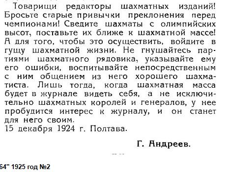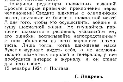 Хочется сказать: отодвиньте от себя шахматный спорт с его мастерами, гроссмейстерами и большими деньгами, верните себе, верните людям замечательную игру в шахматы. |