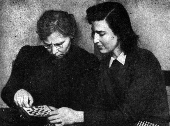 | Н. А. Блукет (слева) и многократная чемпионка Франции Ш. Шоде де Силан за анализом одной из партий чемпионата мира среди женщин, 1950 г. (Публикуется впервые) |