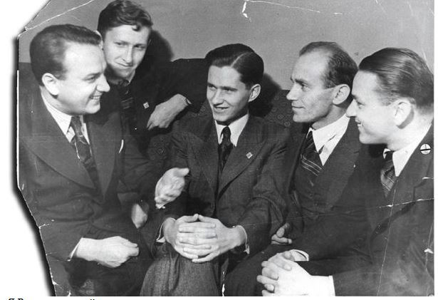 | Эрудированный, всегда элегантно одетый и знавший несколько языков Владимир Петров неизменно вызывал восхищение своих коллег. На фото с Василием Смысловым, Паулем Кересом, Яковом Рохлиным и Владасом Микенасом |