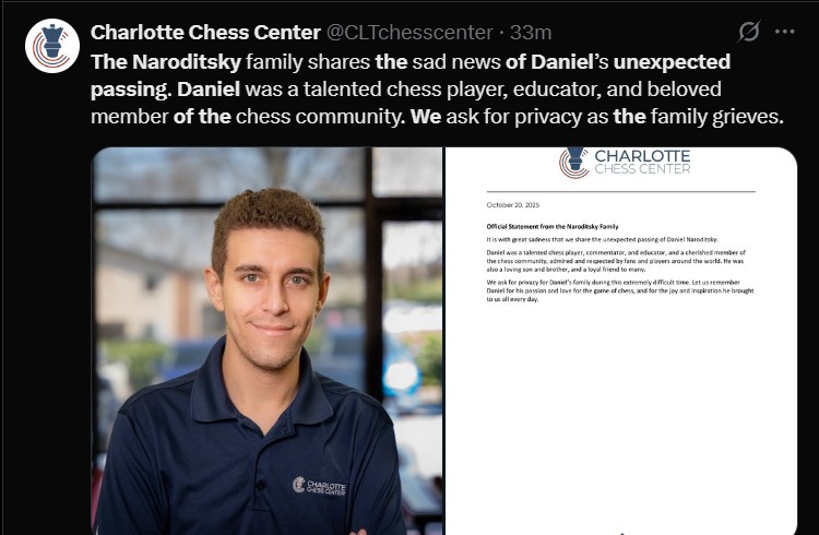 С большой грустью разделяем неожиданную кончину Даниила Народицкого. Даниил был талантливым шахматистом, педагогом и ценным участником шахматного сообщества. Он также был любящим сыном, братом и верным другом.