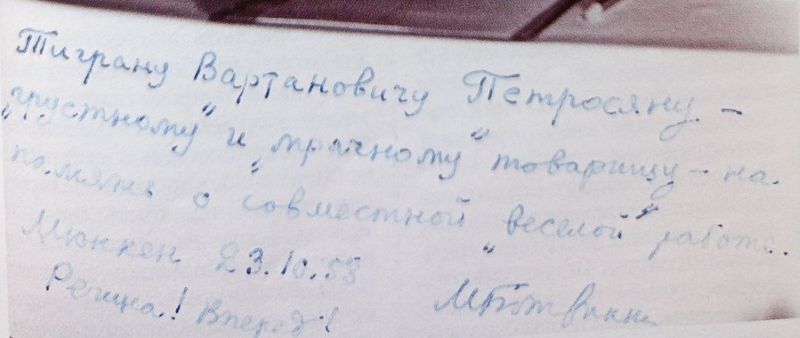 Соперник начал играть. Да, это был знак. Каждый игрок, многие топ-игроки, видели этот знак. Если Петросян вынимал этот прибор из уха, было ясно, что он играет на победу и что он очень… Это немного шутка, но все же: если он был уверен, что у него лучшая позиция и он уже проанализировал ее, то он был одним из лучших в мире в любых позициях, которые он анализировал. Да, хорошо. Я много раз с ним встречался, разговаривал, но у нас никогда не было таких, скажем, близких аналитических контактов.