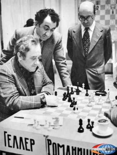 Это, скорее всего, из 43 ч-та СССР, Ереван, 1975. Петросян завоевал свой последний четвертый титул. Романишин занял второе место, выиграв у победителя новинкой 1.c4 Kf6 2.Kc3 e6 3.Kf3 b6 4.e4 Cb7 5.Cd3! Эту партию у Геллера он тоже выиграл, применив свою новую идею в варианте Боголюбова испанской партии. Геллер и Бронштейн остались в середине таблицы. Геллер, которому в том году исполнилось 50 лет, выступил в первенствах СССР еще несколько раз, заняв первое место в 1979 году, а Бронштейн больше в этих турнирах не участвовал.