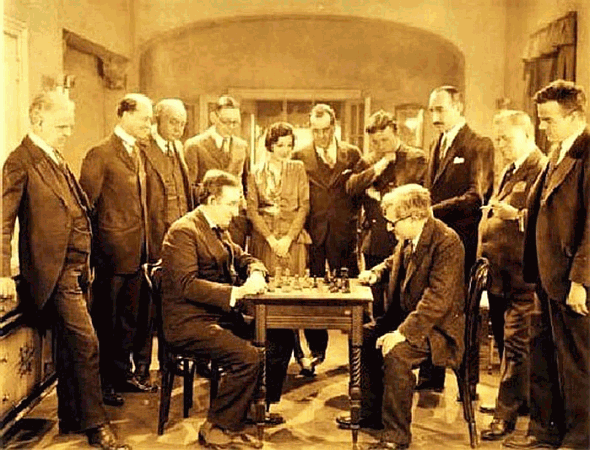 Матч Яновский - Ласкер. Заметно, что чемпион играет с повязкой на глазу.