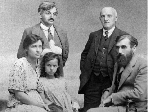 Ласкер с семьёй нидерландского математика-гения Пьера Жозефа Генри Боде (1891–1921, справа вверху, слева внизу: Эрнестина с дочерью, справа внизу: господин Роте (?)) в Берлинхене, 1921 год. Боде интенсивно занимался изобретённой Ласкером игрой «Ласка», которой владел мастерски. [Опубликованное изображение представляет собой восстановленную версию сильно повреждённого оригинала.]