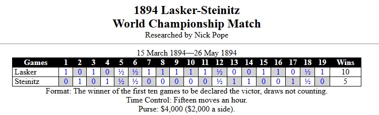 Пятое. Матч должен начаться не позднее второго понедельника марта 1894 года. За одну неделю до начала матча ставки должны быть внесены на хранение у держателя ставок. Не позднее чем за три недели до начала матча каждый игрок обязан внести залог в размере 250 долларов держателю ставок. Если игрок не внесёт оставшиеся 2 000 долларов для полного формирования своей ставки в указанный срок, он теряет внесённый залог в 250 долларов, который переходит к его сопернику.