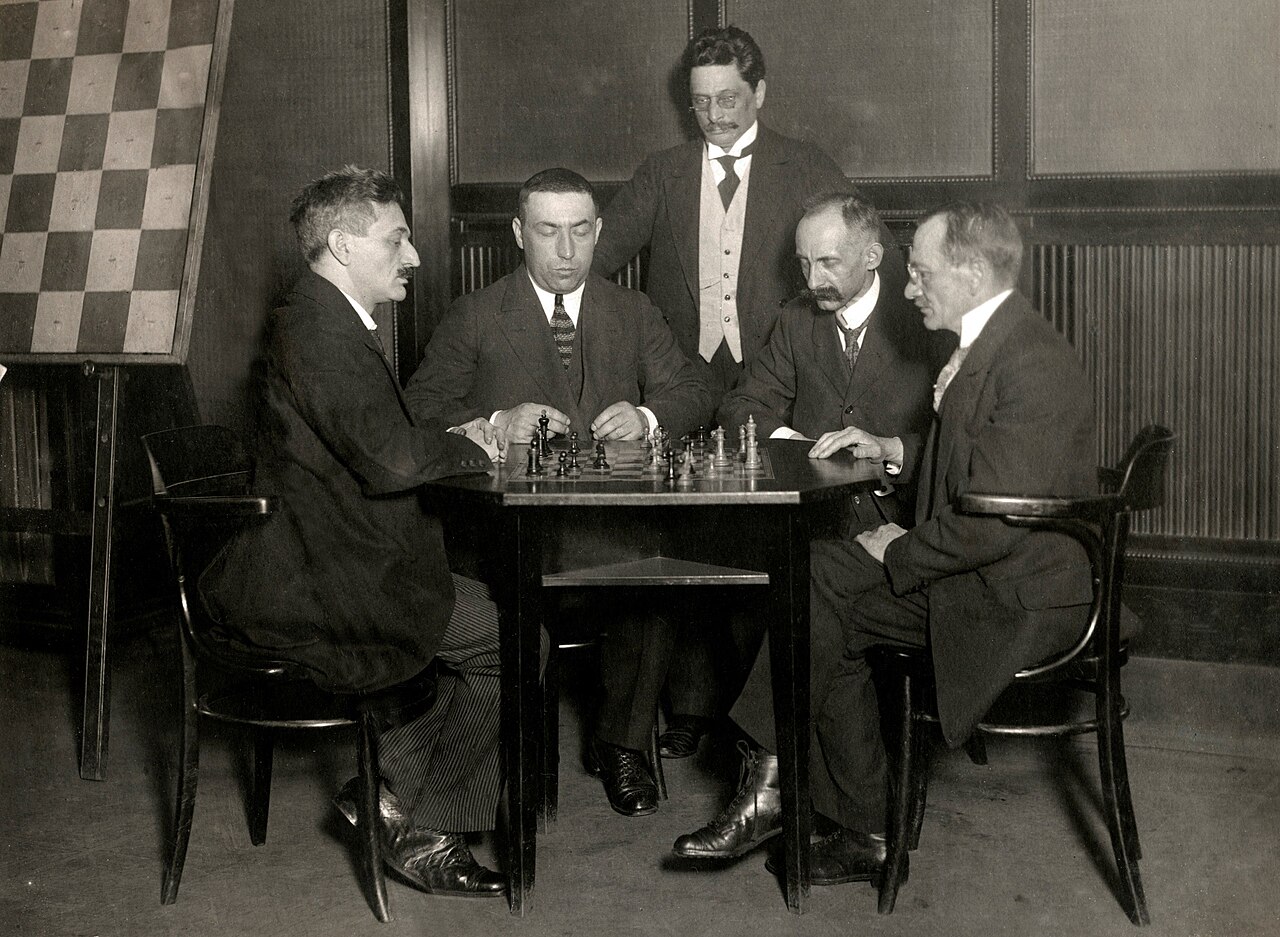 Шахматный турнир в Берлине 1918 года (с 28 сентября по 11 октября). Слева направо: Эмануэль Ласкер, Акиба Рубинштейн, Бернхард Каган, Карл Шлехтер, Зигберт Тарраш.