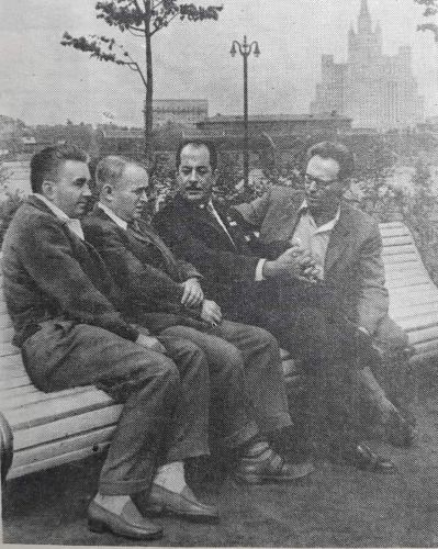 На фото: Полугаевский, Корчной, Штейн, Петросян, Бондаревский и Спасский. Таль отсутствует. |