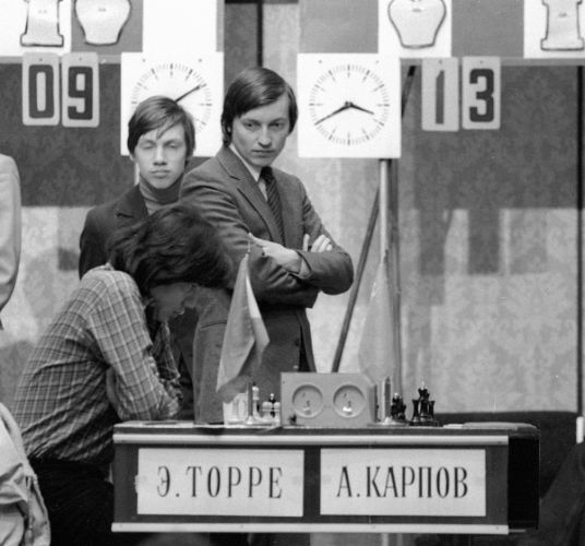 Москва, 13 апреля 1981 года. В седьмом туре международного турнира, проходившего в советской столице, Эухенио Торре (Филиппины) играет с чемпионом мира Анатолием Карповым (СССР). Партия завершилась вничью после 48 ходов. |