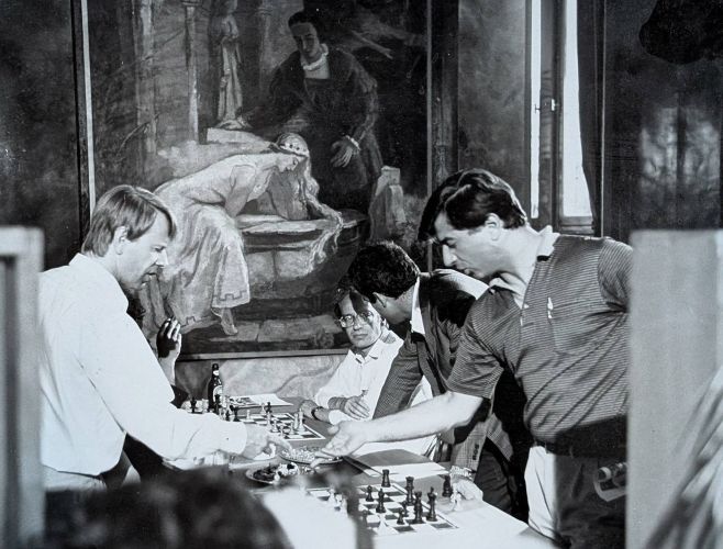 Мемориал Алехина, Москва, 1975 год, Бём-Спасский. Спасский создал небольшой позиционный шедевр против своего собственного ленинградского варианта, большую часть партии обходясь без ладьи на a8; Бём упустил один шанс вернуться в игру: 24.Bd4!
