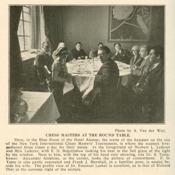 Ф. Д. Йейтс тоже частично скрыт, а Фрэнк Дж. Маршалл, в своей привычной позе, сидит рядом с женой. Отличный профиль доктора Эмануила Ласкера, а также Ричарда Рети, расположенного в крайнем правом углу фотографии.