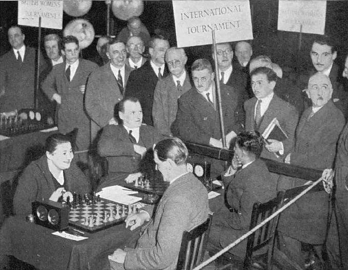 | Короли и королевы шахматной доски: сцена в Центральном зале в Вестминстере, где в прошлый понедельник открылся Международный шахматный фестиваль. На переднем плане мисс В. Менчик, чемпионка среди женщин, противостоит мистеру Геза Мароци; позади — доктор Алехин, чемпион мира, и Султан Хан. |