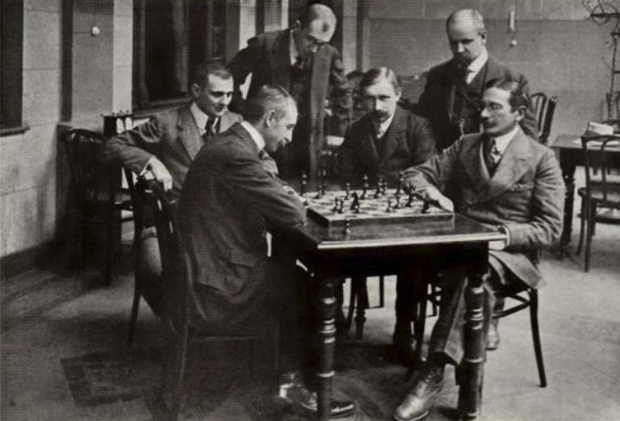 Сидят: д-р Видмар, Берн, Рубинштейн, Н. Тиц*, Шлехтер, Дурас, Маршалл, Нимцович, Алапин