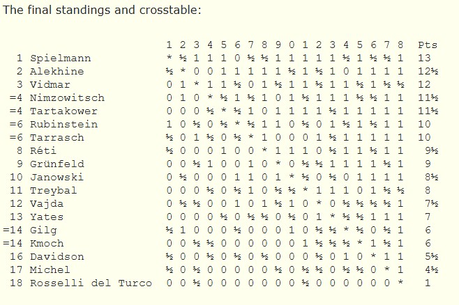 Последний относительно успешный турнир З. Тарраша. Лет за двадцать до этого, победив Маршалла 8:1 и выиграв четырехкруговик в Остенде, 1907, Тарраш утверждал, что у него больше прав на звание Чемпиона Мира, чем у Ласкера. В следующем году они сыграли матч, а вообще с тех остендских пор Тарраш так и не смог больше выиграть ни одного турнира. В отличие от.