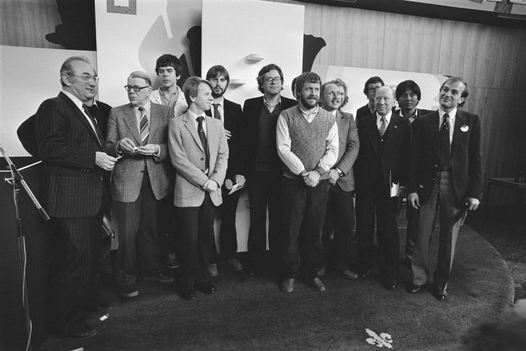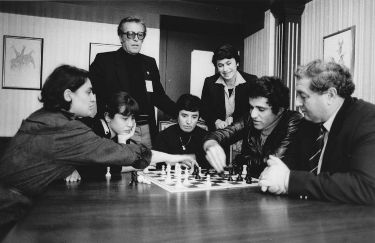 | Вейк-ан-Зее, 12 января 1984 года. Игроки и официальные лица на церемонии открытия традиционного турнира «Хооговенс». Среди участников были Корчной, Белявский, Тукмаков, Майлс, Андерссон, Сосонко, Адорьян, Торре… |