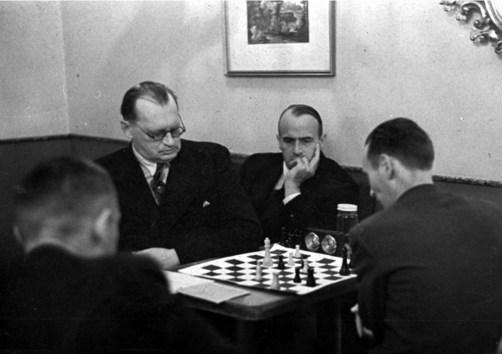 Paul Keres Nõukogude Liidu parimate maletajate turniiril Pärnus. Tagaplaanil Salo Flohr.