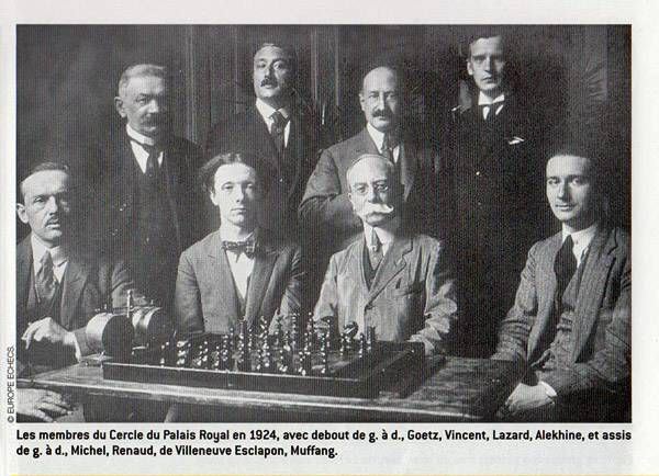 | Члены кружка «Пале-Рояль» в 1924 году: стоят слева направо — Гёц, Винсент, Лазар, Алехин; сидят слева направо — Мишель, Рено, де Вильнёв-Эсклапон, Мюффан. |