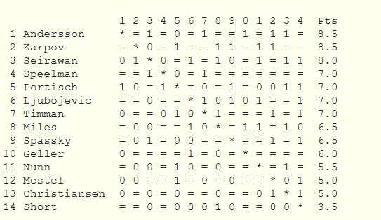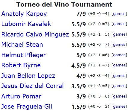 В этой встрече Карпов (белыми) победил сильного испанского мастера. Чемпион мира уверенно доминировал на турнире и выиграл его, не потерпев ни одного поражения.