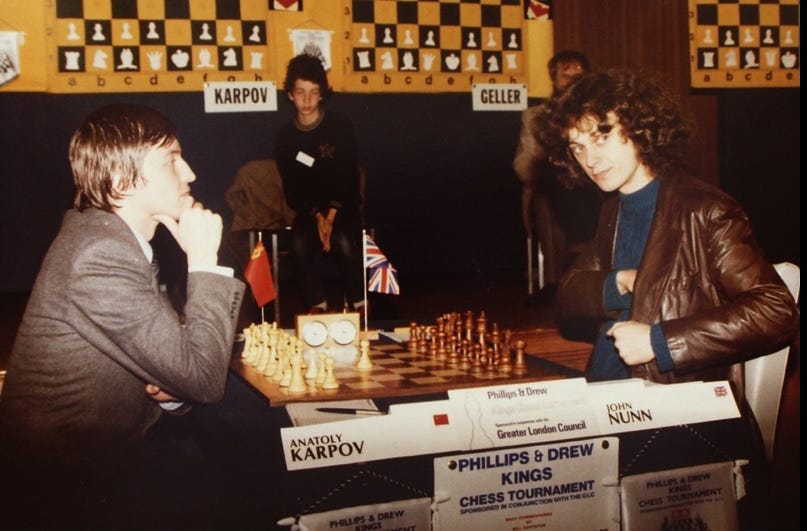 Чемпион мира Анатолий Карпов против Хуана Мануэля Беллона Лопеса, Монтья, 1976.