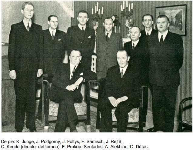 | Baden-Baden 1925. De pie: Mieses, Rubinstein, Carls (detrás), Rabinóvich, Alekhine, Rosselli, te Kolsté, Bogoljúbow, Réti, Tréybal, Torre, Nimzówitsch, Márshall, Tartakówer y Spiélmann; Sentados: Yates, Thomas, Tárrasch, Metger, Grünfeld, Colle y Sämisch. Fuente: Tabla de Flandes. |