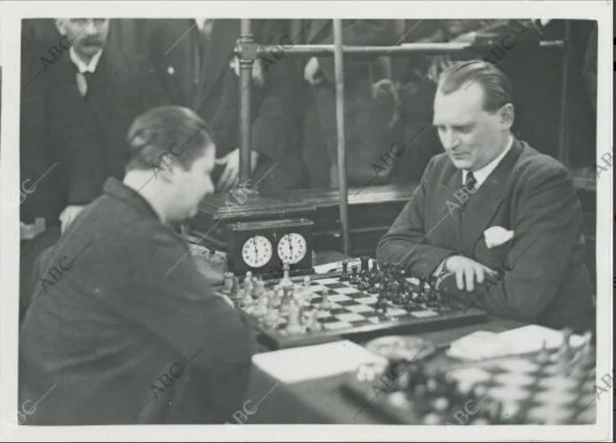 Только фотография эта - из небольшого турнира в Париже того же года, тоже убедительно выигранного Алехиным. Алехин-то черными играет.