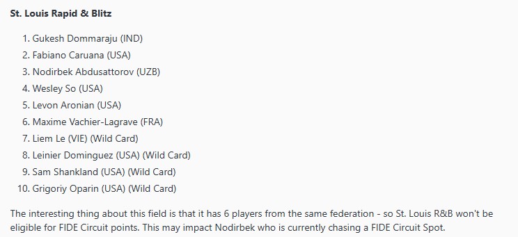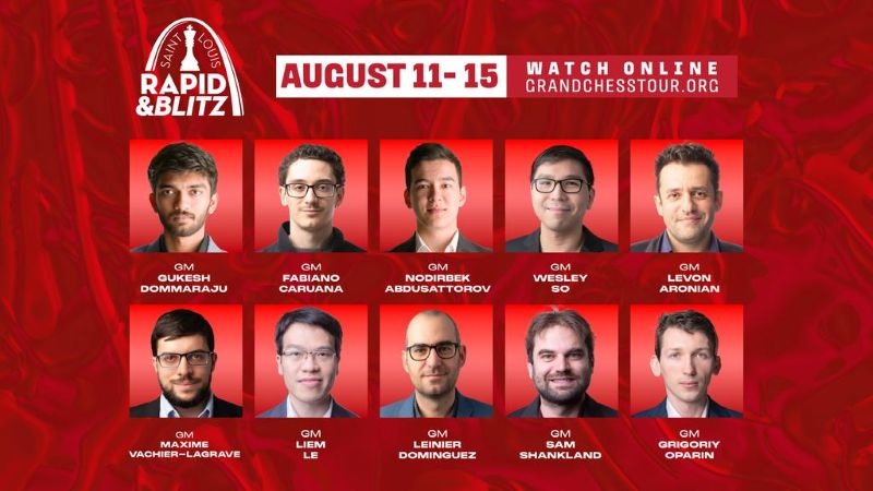 Saint Louis Rapid & Blitz Field: Tour players: Caruana, Gukesh, Abdusattorov, So, Aronian, MVL