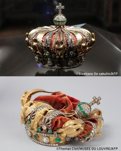 Лувр впервые показал корону императрицы Евгении после кражи. Во время ограбления 19 октября воры в спешке бросили корону на улице. Теперь музейщики впервые показали поврежденный артефакт. Венец жены Наполеона III сильно погнулся, недосчитался одного золотого орла из восьми, а также десяти бриллиантов из 1354. Все 56 изумрудов остались на месте.