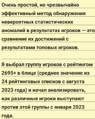 Объяснение любых аномалий и изменений в игре шахматиста единственным- тоже проходили. В каждом процессе есть несколько составляющих, которые влияют, иногда их очень много. И влияние составляющих ( в среднем) будет разным, и читерство среди них- очень часто- будет на последних местах.